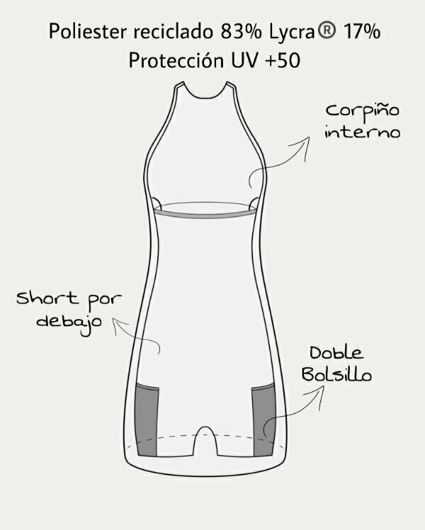 Este vestido deportivo de alto rendimiento cuenta con una estructura interna modeladora que incluye corpiño con soporte, short interno con bolsillos laterales y una falda con vuelo sutil que aporta libertad y movimiento.